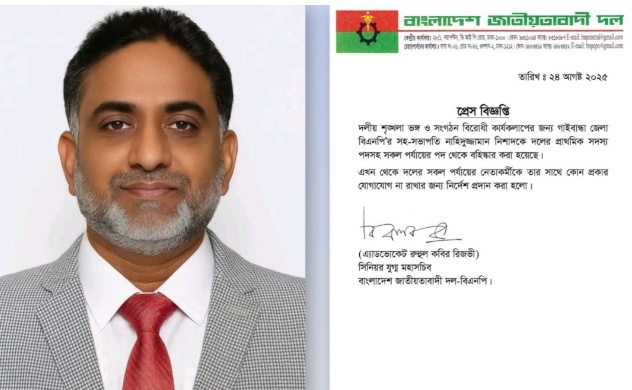 নিজস্ব প্রতিবেদক, দলীয় শৃঙ্খলা ভঙ্গ ও সংগঠনবিরোধী কার্যকলাপের অভিযোগে গাইবান্ধা জেলা বিএনপির সহ-সভাপতি নাহিদুজ্জামান নিশাদকে বহিষ্কার করা হয়েছে। রোববার (২৪